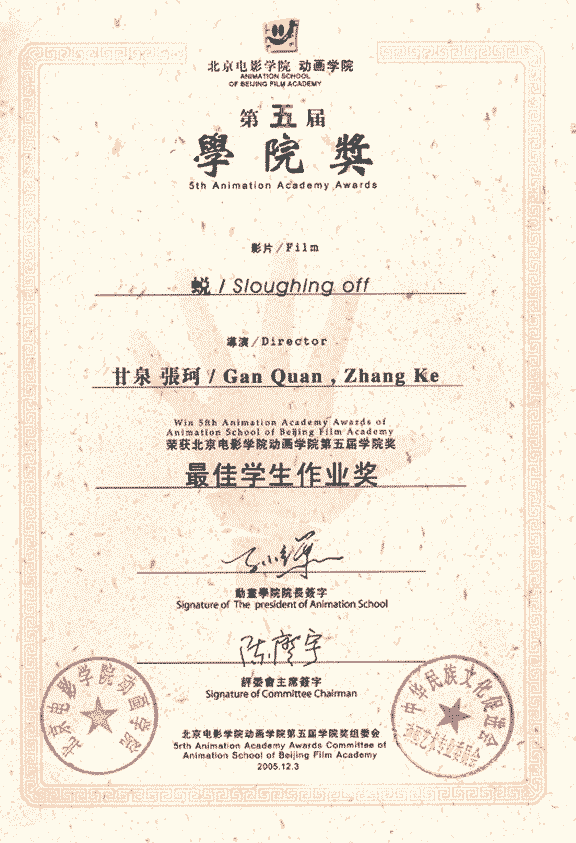 2005年,可謂我院動畫專業(yè)的豐收年。近日,獲獎喜訊接連傳來。由我院數(shù)字藝術(shù)系05屆動畫專業(yè)畢業(yè)生甘泉、張珂攜手創(chuàng)作的動畫短片《蛻》,在中華民族文化促進會動畫藝術(shù)專業(yè)委員會、北京電影學院動畫學院聯(lián)合舉辦的動漫作品大賽中,榮獲北京電影學院動畫學院第五屆學院獎最佳學生作業(yè)獎。