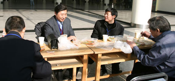 、郭兆志、刁在祥、張云龍等院領導在報名現場與工作人員一起共進工作餐。