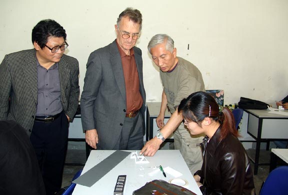 繼昨日所有學員Exercise A 的設計方案在雷曼教授指導下完成后,今天上午進入模型制作階段。模型采用萬通板、美工刀、剪刀、膠帶等材料和工具制作,雷曼教授演示了材料的性質和使用方法,并為每位學員進行了詳細的輔導,以便讓每個模型都能達到精益求精的效果。