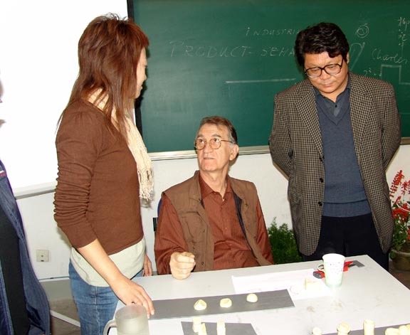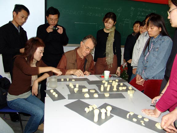 上午,雷曼教授對11月8日與11月9日兩天學員們Exercise A的設計作品進行了集體演示性講評。隨后,雷曼教授開始布置Exercise B,在這個練習中,要求學員用橡皮泥設計制作“同系列按鈕”,分別完成提(Pull)、按(Push)和旋轉(Turn)三種功能的形態設計。雷曼教授重點強調,學員在設計過程中一定要注意同一系列中的每一個按鈕功能的語義要清晰,簡潔明了。學員們在雷曼教授的精心指導下,從各種角度構思設計了幾組不同的橡皮泥按鈕模型。在一天的教學過程中,雷曼教授兩次對學員的作品進行了集體講評和多次個別輔導、演示。