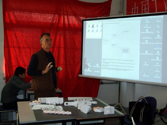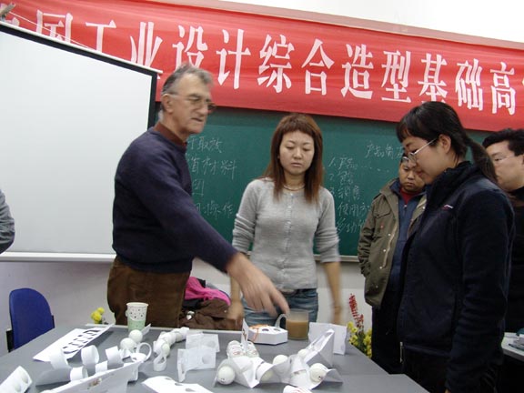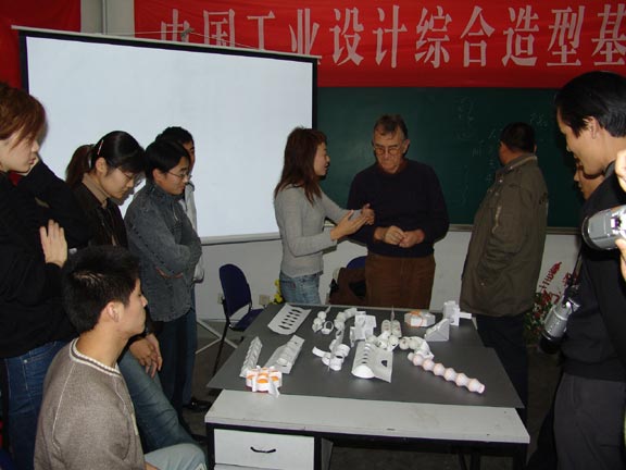 下午14:00,雷曼教授對這一周以來的練習情況進行總結、演示、講評。隨后,他從理論上為學員介紹了一個好的工業產品所具備的特點-首先必須從實用性和功能性上著手,然后注重設計的外觀(比如如何處理好形態、色彩、包裝等之間的各種關系)。他說,一般而言處理功能和外觀的關系時各占60%和40%。另外,雷曼教授還向學員介紹了產品設計的整個過程(程序)并就現代工業設計教學中大家關心的問題回答了學員的提問。