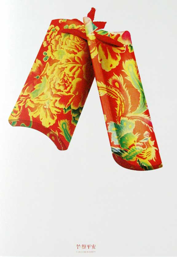 作品《竹報平安》以中國傳統(tǒng)的曲藝表演道具——快板作為設(shè)計元素,貼上山東沂蒙山區(qū)特有的代表富貴祥和和富強騰飛的"飛凰"彩布,彩布上的牡丹寓意富貴、祥和、吉祥;鳳凰圖案象征騰飛,整個形態(tài)又樹成一個“人”字 ,突出了建設(shè)"平安山東"以人為本的內(nèi)涵,鮮明地反映了濃郁的山東地域特色和傳統(tǒng)藝術(shù)風(fēng)味,構(gòu)圖簡潔,紅色作為主色調(diào)視覺沖擊強烈,喜慶平安主題表現(xiàn)得非常到位。除了視覺沖擊外,給人以清脆的聽覺聯(lián)想,達(dá)到了多種表現(xiàn)元素的極度統(tǒng)一。