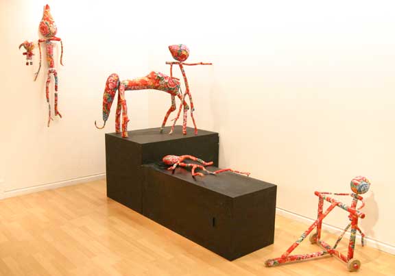 作品《生命!》共360余件,形態(tài)有人物,動物,用具,現(xiàn)成作品改造等等。形式多樣,有立有掛、有垂吊、有互動,材料主要是干樹枝、葫蘆、大花棉布等一些“不損壞”材料。她的作品在某種程度上是摘下藝術(shù)的眼鏡,只是站在“人”的位子,對自然、生命、存活最初、最本性的思考的原位。