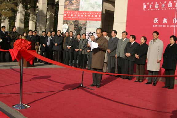李鐵映、何魯麗、郝建秀、孫家正、李從軍、陳曉光、覃志剛、李牧、靳尚誼、劉大為、華君武、王琦等為金獎(jiǎng)獲得者頒獎(jiǎng)。隨后,李鐵映、何魯麗、郝建秀、孫家正、李從軍、陳曉光、覃志剛、李牧、靳尚誼、華君武為第十屆全國(guó)美展獲獎(jiǎng)作品展開(kāi)幕式剪彩。