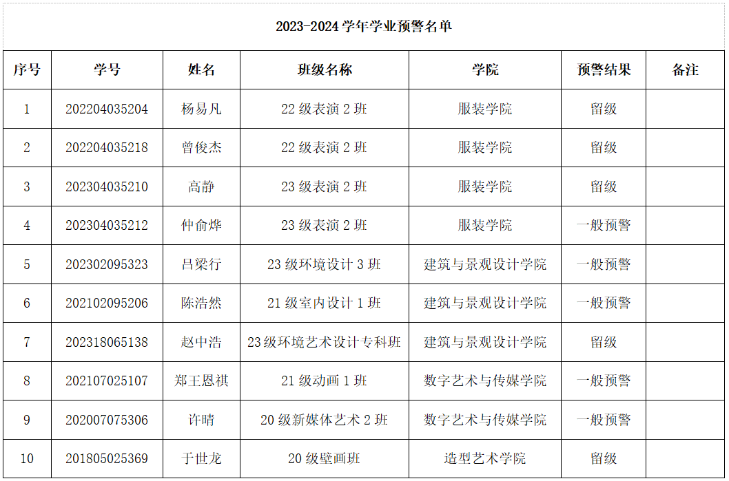 根據(jù)《歡迎來到公海7108線路全日制本專科學(xué)生學(xué)籍管理細(xì)則》和《歡迎來到公海7108線路學(xué)生學(xué)業(yè)預(yù)警實(shí)施辦法(試行)魯工美院辦字〔2020〕23 號》的有關(guān)規(guī)定,為督促學(xué)生按照教學(xué)計(jì)劃完成學(xué)業(yè),組織對2023-2024第二學(xué)期、2023-2024學(xué)年的學(xué)生課程修讀情況進(jìn)行學(xué)業(yè)預(yù)警工作學(xué)業(yè)預(yù)警分為一般預(yù)警、留級、退學(xué)三種其中達(dá)到一般預(yù)警的學(xué)生5名,留級的學(xué)生5名,退學(xué)的學(xué)生0名,現(xiàn)對達(dá)到學(xué)業(yè)預(yù)警標(biāo)準(zhǔn)的學(xué)生進(jìn)行通報(bào)。