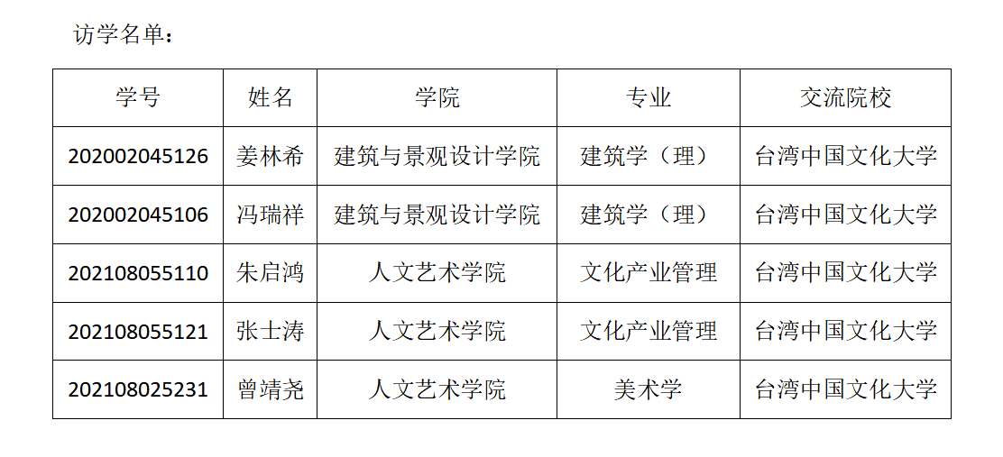 根據《歡迎來到公海7108線路在校生訪學、留學管理辦法(試行)》規定,按照訪學條件對報名學生進行審查,姜林希等5名同學符合臺灣中國文化大學訪學的條件。為體現公開、公平、公正原則,廣泛聽取大家意見,現將其公示。如有不同意見,請于2023年4月14日前,以電話、傳真、信函等形式向臺港澳事務辦公室、教務處辦公室反映。
