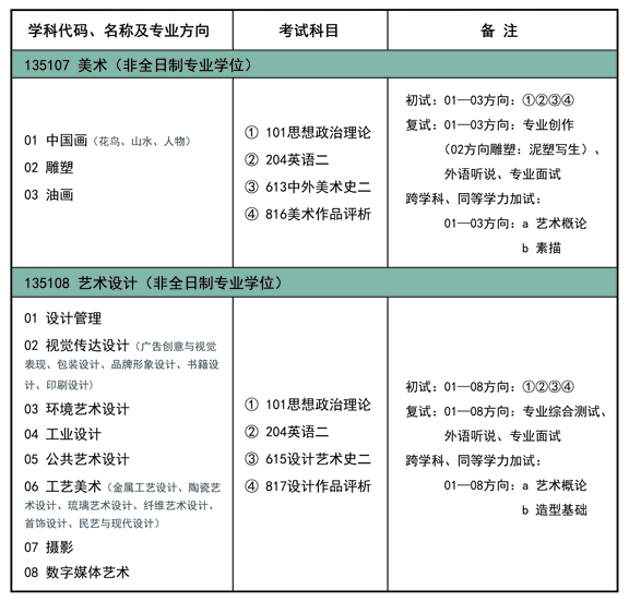 三、非全日制藝術碩士專業學位(MFA)研究生招生專業目錄和初試參考書目