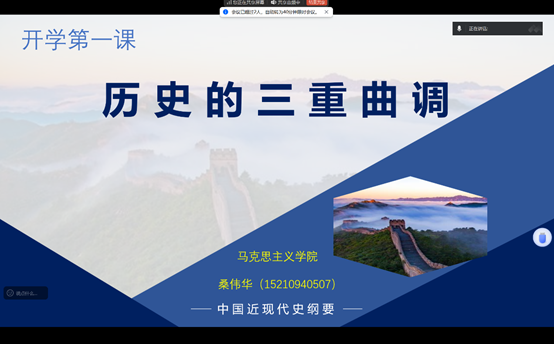 桑偉華老師以《歷史的三重曲調(diào)》為題,圍繞“為什么要學習中國近現(xiàn)代史、如何認識中國近現(xiàn)代史的分期、如何把握中國近現(xiàn)代史綱要的學習目的和要求”三個方面展開講授。通過結合史實及影像資料,向?qū)W生們立體地展示了中國近現(xiàn)代歷史與中國共產(chǎn)黨百年奮斗歷史的共同主題——實現(xiàn)中華民族偉大復興。引導青年大學生樹立起正確的歷史觀和價值觀。