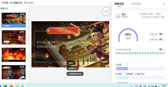 程雅淇老師巧妙引用了春節(jié)期間的熱點話題,如備受期待的《哪吒2》電影、人工智能領域的領軍企業(yè)DeepSeek,以及春晚中的精彩瞬間,引導學生思考傳統(tǒng)文化與現(xiàn)代科技的融合與發(fā)展。通過鮮活的案例,程老師不僅激發(fā)了學生的學習興趣,更讓他們深刻理解了思政課程的現(xiàn)實意義。這堂課不僅是一次知識的傳遞,更是一次思想的啟迪,展現(xiàn)了思政教育的時代魅力與創(chuàng)新活力。