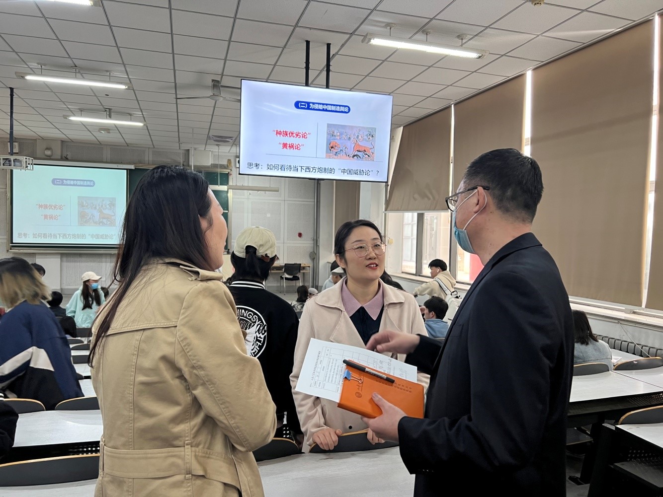 聽課過程中,韓文濤和張曉寧認真記錄,課后就教學方法運用和教學效果呈現與張潔老師進行交流。韓文濤和張曉寧充分肯定了張潔老師課堂設計完整,與學生溝通交流順暢,整體課堂教學實施效果好。韓文濤指出,思政教師要發揮思想政治教育的主渠道作用,既要傳授教材知識,又要堅持學生的主體地位,建議今后教師在課堂容量較大的情況下,多給學生自由討論的時間,提高他們參與課堂的積極性和主動性。