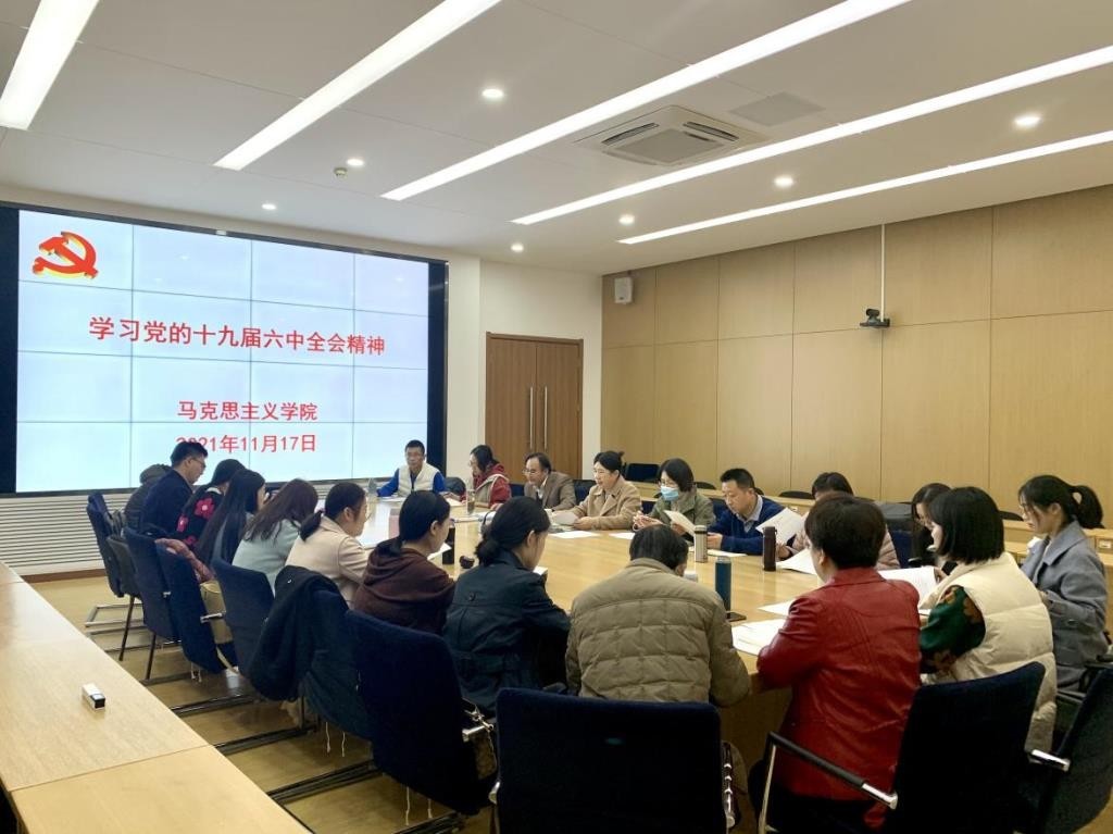 11月17日下午,馬克思主義學院黨總支組織全體教職工學習黨的十九屆六中全會精神。黨總支副書記任偉清主持,丁炳堂、張琰及教職工參加。