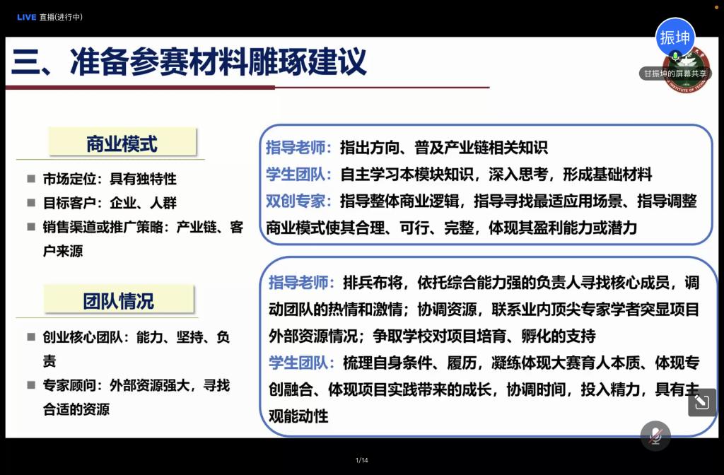 5月15日晚,教務處、學生處、團委、創新創業學院聯合組織的創新創業教育系列講座之五《把握關鍵要素,提升參賽材料競爭力》以線上方式舉辦。講座由北京理工大學團委副書記、人社部“青年就業創業指導專家”甘振坤主講,學校師生共同觀看講座。