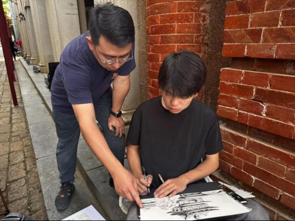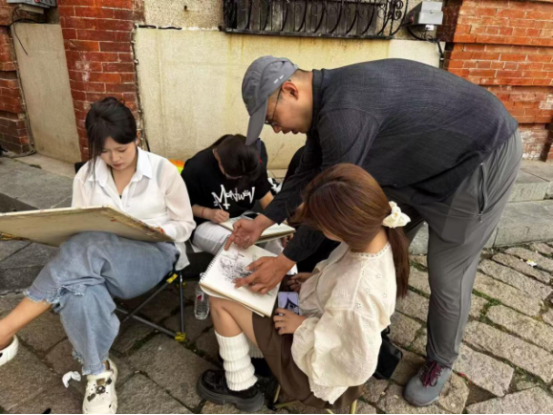 寫生過程中,指導老師們全程陪伴,目光時刻聚焦在同學們的創(chuàng)作過程中。從構圖布局到色彩運用,從筆觸技法到情感表達,老師們都會耐心細致地進行指導。