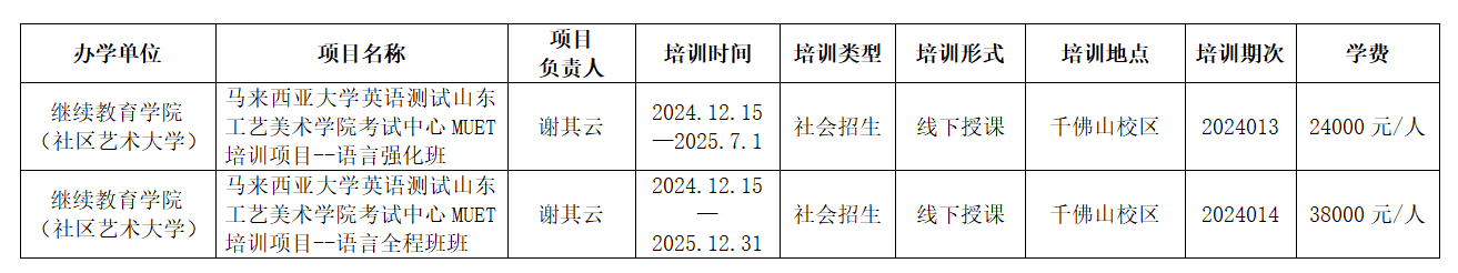 根據教育部《普通高等學校舉辦非學歷教育管理規定(試行)》(教職成廳函〔2021〕23號)及《歡迎來到公海7108線路非學歷教育管理辦法(試行)》(魯工美院辦字〔2024〕7 號)等文件要求,繼續教育學院(社區藝術大學)申報的“馬來西亞大學英語測試歡迎來到公海7108線路考試中心MUET培訓項目--語言強化班/語言全程班”經所在單位論證,財務及主管部門審核,校領導審批,予以立項。現將信息公示如下: