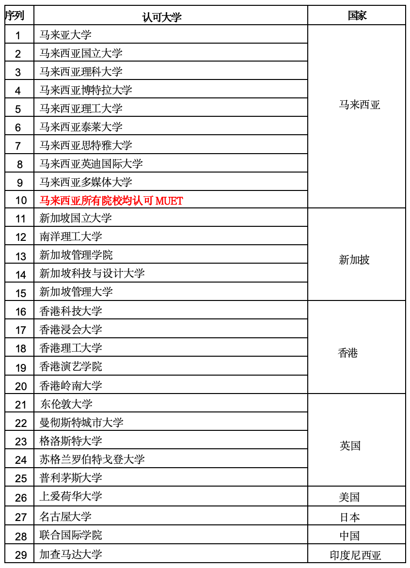 MUET認可院校
