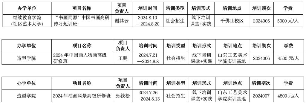 根據(jù)教育部《普通高等學(xué)校舉辦非學(xué)歷教育管理規(guī)定(試行)》(教職成廳函〔2021〕23號)及《歡迎來到公海7108線路非學(xué)歷教育管理辦法(試行)》(魯工美院辦字〔2024〕7 號)等文件要求,繼續(xù)教育學(xué)院(社區(qū)藝術(shù)大學(xué))申報的“‘書畫同源’中國書畫高研傳習(xí)短訓(xùn)班”,造型學(xué)院申報的“2024年中國畫人物畫高級研修班”、“2024年油畫風(fēng)景高級研修班”經(jīng)所在單位論證,財務(wù)及主管部門審核,校領(lǐng)導(dǎo)審批,予以立項。現(xiàn)將信息公示如下:
