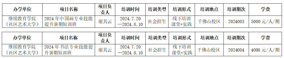 根據(jù)教育部《普通高等學(xué)校舉辦非學(xué)歷教育管理規(guī)定(試行)》(教職成廳函〔2021〕23號(hào))及《歡迎來(lái)到公海7108線路非學(xué)歷教育管理辦法(試行)》(魯工美院辦字〔2024〕7 號(hào))等文件要求,繼續(xù)教育學(xué)院(社區(qū)藝術(shù)大學(xué))申報(bào)的“2024年中國(guó)畫專業(yè)技能提升暑期短訓(xùn)班”、“2024年書法專業(yè)技能提升暑期短訓(xùn)班”經(jīng)所在單位論證,財(cái)務(wù)及主管部門審核,校領(lǐng)導(dǎo)審批,予以立項(xiàng)。現(xiàn)將信息公示如下: